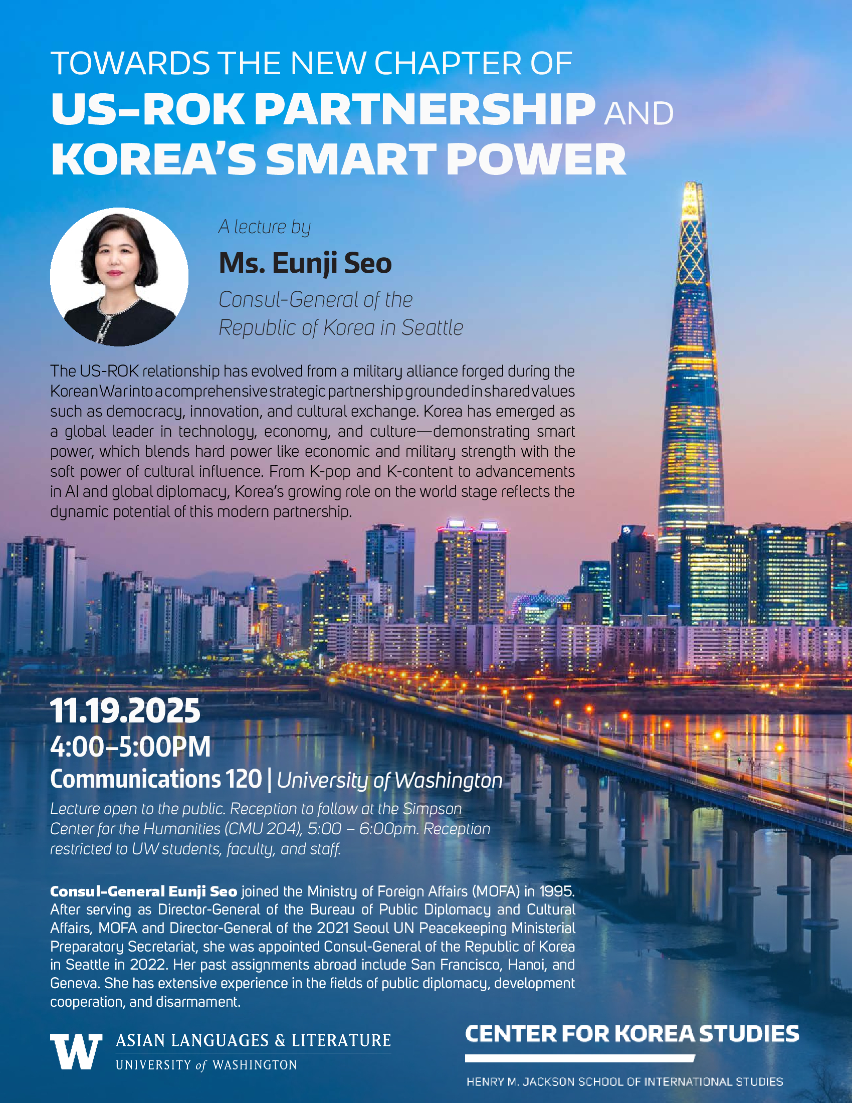 ¿ö½ÌÅÏ´ëÇб³ Çѱ¹Çבּ¸¼Ò(UW Center for Korea Studies, ¼ÒÀå ÇÏ¿ëÃâ ±³¼ö)¿Í ¾Æ½Ã¾Æ¾ð¾î¹®Çаú(Department of Asian Languages and Literature)¿¡¼´Â ¿À´Â 11¿ù 19ÀÏ ¼ÀºÁö ½Ã¾ÖƲ ÃÑ¿µ»ç´ÔÀ» ¸ð½Ã°í "Towards the New Chapter of US-ROK Partnership and Korea¡¯s Smart Power"¸¦ ÁÖÁ¦·Î Ư° Çà»ç¸¦ ÁøÇàÇÒ ¿¹Á¤ÀÔ´Ï´Ù.