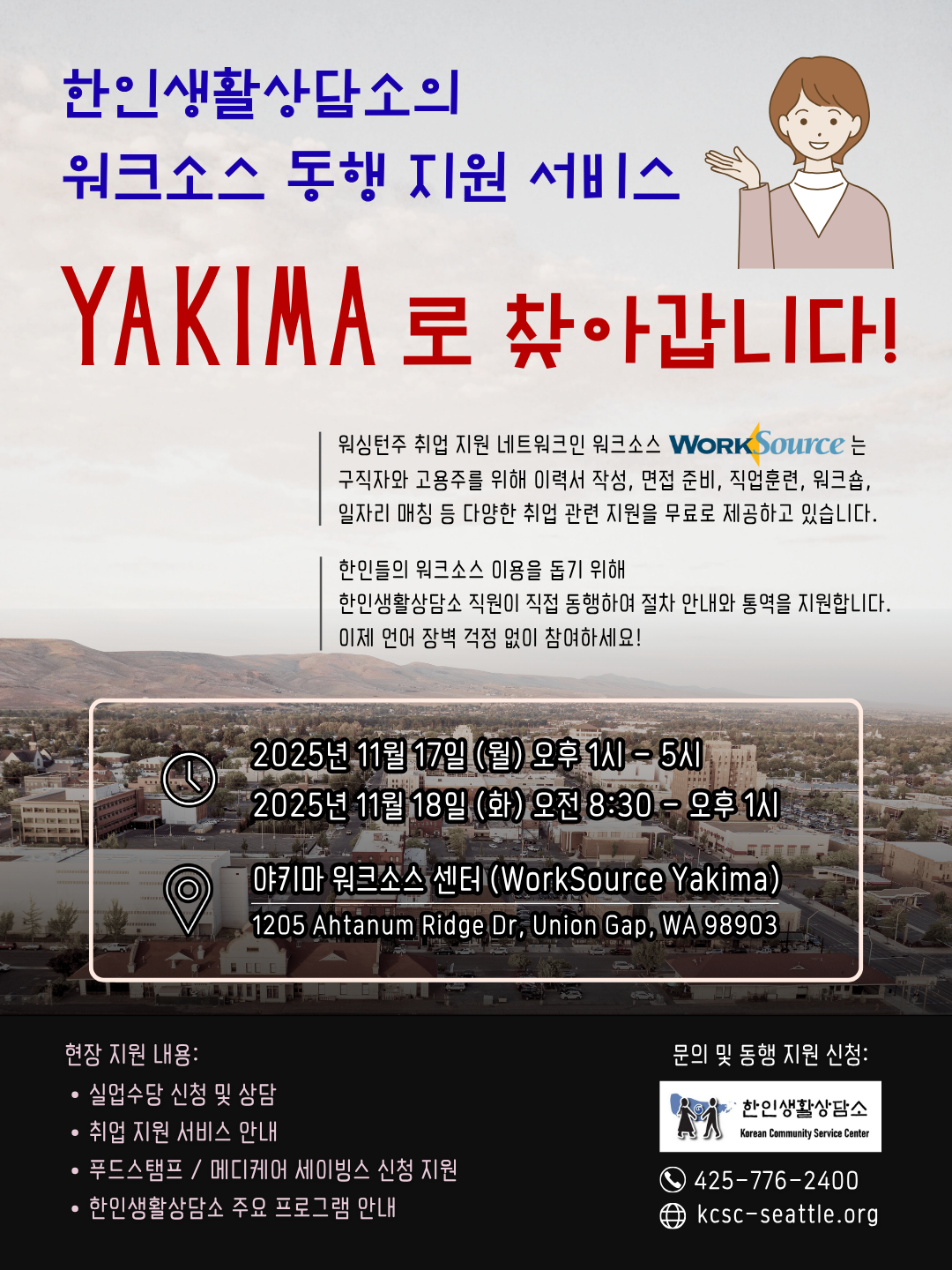 ƯÈ÷, Yakima Áö¿ª¿¡ °ÅÁÖÇÏ´Â ÇÑÀεéÀ» À§ÇØ, ÇÑÀλýȰ»ó´ã¼Ò Á÷¿øµéÀÌ 11/17/25 ¿ÀÈÄ 1½ÃºÎÅÍ 5½Ã±îÁö, 11/18/25 ¿ÀÀü 8½Ã 30ºÐºÎÅÍ