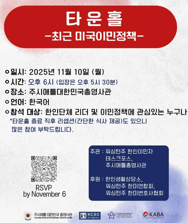 ³¯·Î ½É°¢ÇØÁö´Â ¹Ì±¹ À̹ΠÁ¤Ã¥ ¹× À̹α¹(ICE) ÇàÁ¤À¸·Î ÀÎÇØ ¾î·Á¿òÀ» °Þ´Â ÇÑÀÎ À̹ÎÀÚµéÀ» µ½±â À§ÇÑ Áß¿äÇÑ Çà»ç°¡ °³Ãֵ˴ϴÙ. ÁÖ ½Ã¾ÖƲÃÑ¿µ»ç°ü°ú ÇÑÀÎ À̹ÎÀÚ Å½ºÅ©Æ÷½º(Korean Immigrant Task Force)´Â ¿À´Â 11¿ù 10ÀÏ ¿ù¿äÀÏ Å¸¿îȦ ¹ÌÆÃÀ» °øµ¿ ÁÖ°üÇÕ´Ï´Ù.