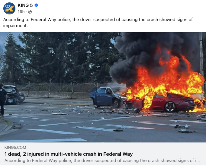 ÀÏ¿äÀÏÀÎ ¾îÁ¦(15ÀÏ) ¿ÀÀü, Æä´õ·²¿þÀÌ(Federal Way)ÀÇ ÇÑ ±³Â÷·Î¿¡¼ 5Áß Ãßµ¹ »ç°í°¡ ¹ß»ýÇØ 1¸íÀÌ ¼ûÁö°í 2¸íÀÌ ´ÙÃÆ½À´Ï´Ù.