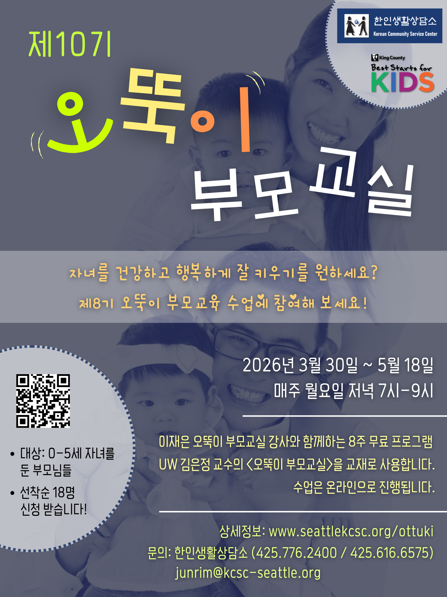 Âü°¡ ´ë»óÀº ¼±Âø¼ø 18¸íÀ̸ç, µî·Ï ±â°£Àº 2¿ù 20ÀϺÎÅÍ 3¿ù 23ÀϱîÁöÀÔ´Ï´Ù. ½ÅûÀº ¿Â¶óÀÎ ¸µÅ©(https://tinyurl.com/kcsc-parent-programs)¸¦¸¦) ÅëÇØ °¡´ÉÇϸç, ÀÚ¼¼ÇÑ ¹®ÀÇ´Â ÇÑÀλýȰ»ó´ã¼Ò(425-776-2400) ¶Ç´Â ¹ÚÁظ² ºÎ¸ð±³À° ½ºÆä¼È¸®½ºÆ®¿¡°Ô ÇÏ¸é µË´Ï´Ù.