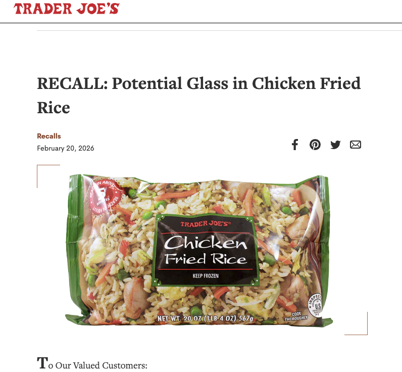 ¸®ÄÝ ´ë»óÀº 20¿Â½º ÇÃ¶ó½ºÆ½ ºÀÁö¿¡ ´ã±ä 'Æ®·¹ÀÌ´õ Á¶ ġŲ ººÀ½¹ä(Trader Joe¡¯s Chicken Fried Rice)'À¸·Î, À¯Åë±âÇÑÀÌ 2026³â 9¿ù 8ÀϺÎÅÍ 11¿ù 17ÀÏ »çÀ̷Πǥ±âµÈ Á¦Ç°ÀÔ´Ï´Ù. Á¦Ç° Æ÷ÀåÁö ¾ÈÂÊ USDA °Ë»ç ¸¶Å©¿¡´Â 'P-18356'À̶ó´Â ¹øÈ£°¡ ÂïÇô ÀÖ½À´Ï´Ù. ¶ÇÇÑ ¾ÆÁö³ë¸ðÅä ÃøÀº ij³ª´Ù¿¡¼ ÆÇ¸ÅµÈ '¾ßŰÅ丮 ġŲ°ú ÀϺ»½Ä ¹ä' ¼¼Æ® Á¦Ç°µµ ÇÔ²² ¸®ÄÝÇϰí ÀÖ½À´Ï´Ù.