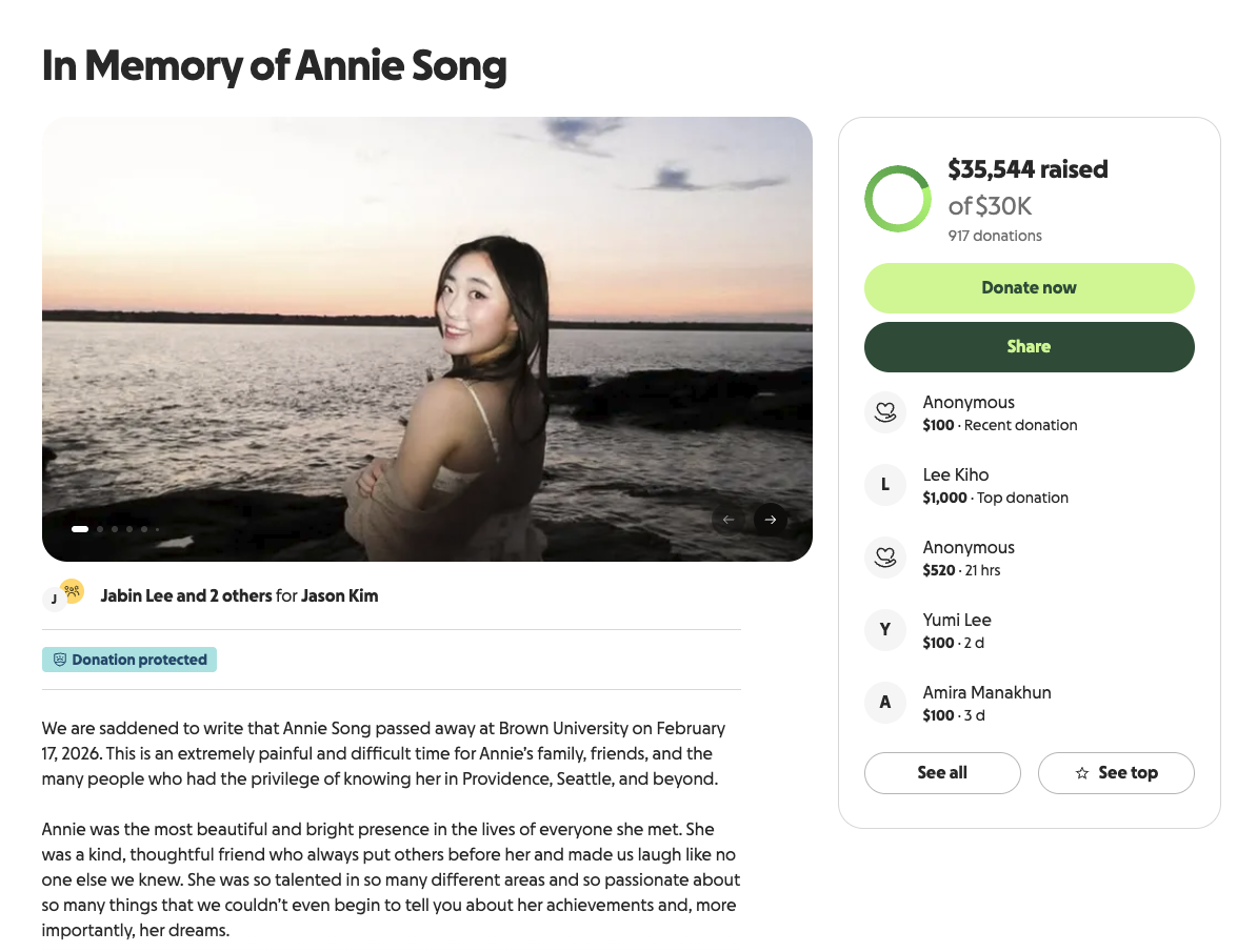 ÇöÁö ¾ð·Ð WJAR 10°ú °íÆÝµå¹Ì(GoFundMe) ¸ð±Ý ÆäÀÌÁö¿¡ µû¸£¸é, ½Ã¾ÖƲ Ãâ½ÅÀÇ ¾Ö´Ï ¼Û(Annie Song) ¾¾°¡ Áö³ÁÖ È¿äÀÏ(19ÀÏ) ±³³» ±â¼÷»ç¿¡¼ ¼ûÁø ä ¹ß°ßµÇ¾ú½À´Ï´Ù. °æÂû°ú ÇöÁö ¼ö»ç ´ç±¹Àº ÇöÀç±îÁö À̹ø »ç°Ç¿¡¼ Ÿ»ì µî ¹üÁË ÇøÀÇÁ¡Àº ¹ß°ßµÇÁö ¾Ê¾Ò´Ù°í ¹àÇû½À´Ï´Ù.