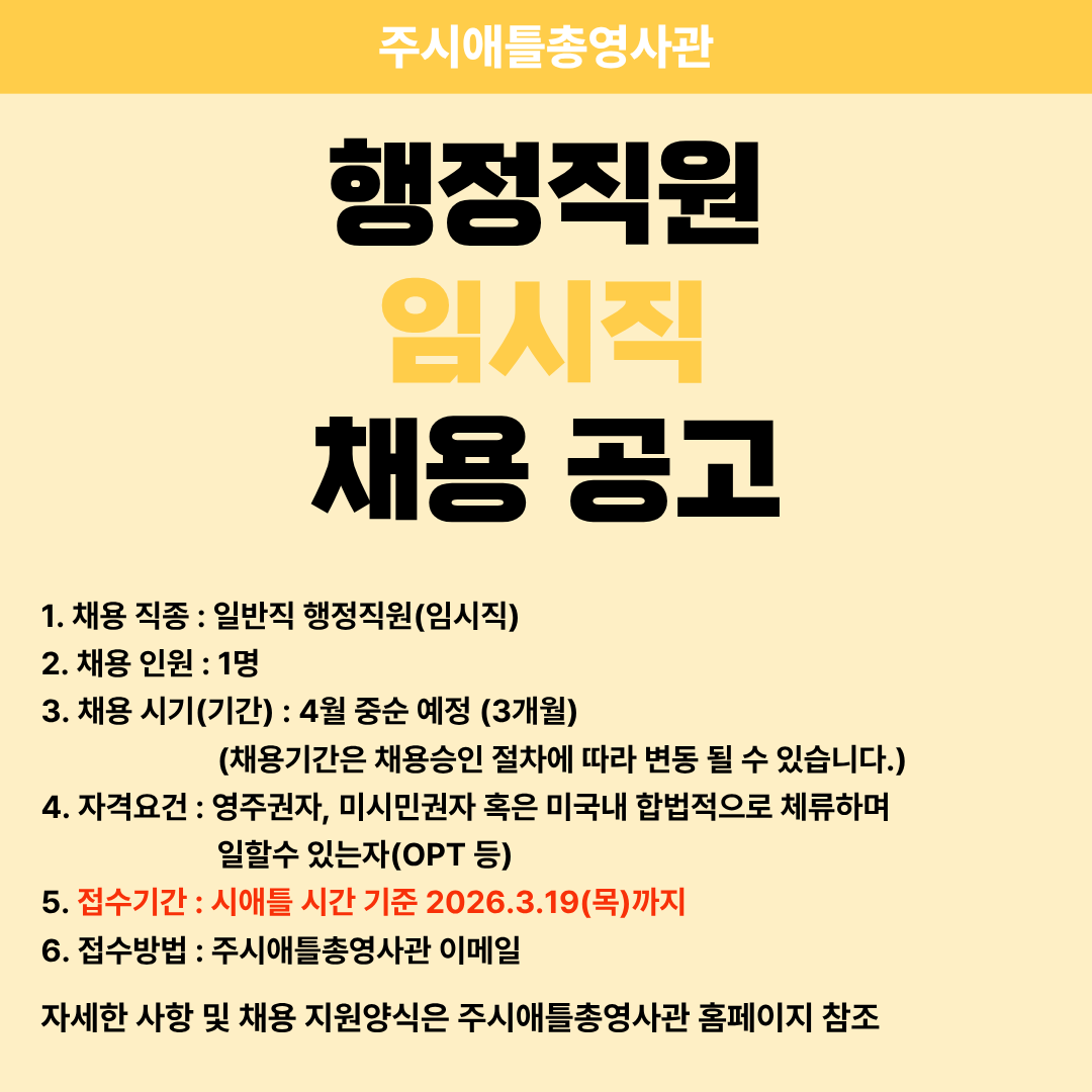 ÁÖ½Ã¾ÖÆ²ÃÑ¿µ»ç°üÀº ¾Æ·¡¿Í °°ÀÌ ¿µÁÖ±ÇÀÚ/½Ã¹Î±ÇÀÚ/¹Ì±¹³» ÇÕ¹ýÀûÀ¸·Î ü·ùÇϸç ÀÏÇÒ ¼ö ÀÖ´Â ÀÚ(OPT µî)À» ´ë»óÀ¸·Î 3°³¿ù ÀÓ½ÃÁ÷ ÇàÁ¤Á÷¿øÀ» ä¿ëÇϰíÀÚ ÇÏ¿À´Ï, °ü½É ÀÖÀ¸½Å ºÐµéÀÇ ¸¹Àº Áö¿ø ºÎʵ右´Ï´Ù.