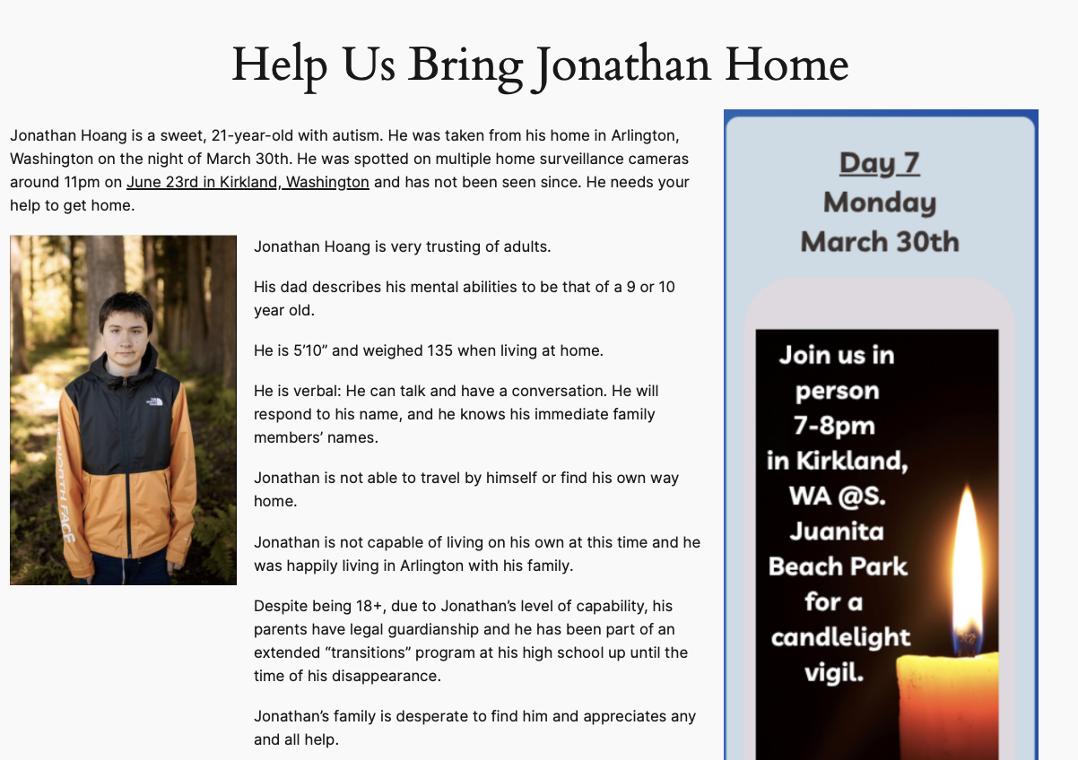 Ȳ ±ºÀÇ °¡Á·Àº ¿À´Ã ¿ÀÈÄ 7½Ã, ĿŬ·£µå ÁÖ´ÏŸ ºñÄ¡ ÆÄÅ©(Juanita Beach Park)¿¡¼ ½Ã¹Îµé°ú ÇÔ²²ÇÏ´Â Ã߸ðÁ¦¸¦ ¿ ¿¹Á¤ÀÔ´Ï´Ù. ÀÌ Àå¼Ò´Â Áö³ÇØ 6¿ù, ±æÀ» ÀÒ°í Çì¸Å´Â µíÇÑ ÀþÀº ³²¼ºÀÇ ¸ð½ÀÀÌ Àα٠ÁÖÅð¡ CCTV¿¡ Æ÷ÂøµÇ¾ú´ø °÷À¸·Î, °¡Á·µéÀº ¿µ»ó ¼Ó Àι°ÀÌ È² ±ºÀÏ °¡´É¼ºÀÌ ³ô´Ù°í ¹Ï°í ÀÖ½À´Ï´Ù.