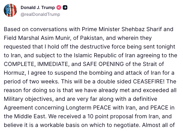 Æ®·³ÇÁ ´ëÅë·ÉÀº ÀÚ½ÅÀÇ ¼Ò¼È¹Ìµð¾î¸¦ ÅëÇØ "À̶õÀÌ È£¸£¹«Áî ÇØÇùÀ» Áï°¢ÀûÀÌ°í ¾ÈÀüÇÏ°Ô ¿ÏÀüÈ÷ °³¹æÇÑ´Ù´Â Á¶°Ç ÇÏ¿¡ 2ÁÖ°£ÀÇ Æø°Ý°ú °ø°ÝÀ» Áß´ÜÇϱâ·Î Çß´Ù"°í ¹àÇû½À´Ï´Ù. Æ®·³ÇÁ ´ëÅë·ÉÀº À̾î "ÀÌ¹Ì ¸ðµç ±º»çÀû ¸ñÇ¥¸¦ ´Þ¼ºÇ߰ųª Ãʰú ´Þ¼ºÇß´Ù"¸ç "À̶õÀ¸·ÎºÎÅÍ ¹ÞÀº '10°³ Ç×ÀÇ Á¦¾È¼'°¡ Çù»óÀÇ ½ÇÁúÀûÀÎ Åä´ë°¡ µÉ ¼ö ÀÖ´Ù°í ¹Ï´Â´Ù"°í µ¡ºÙ¿´½À´Ï´Ù.