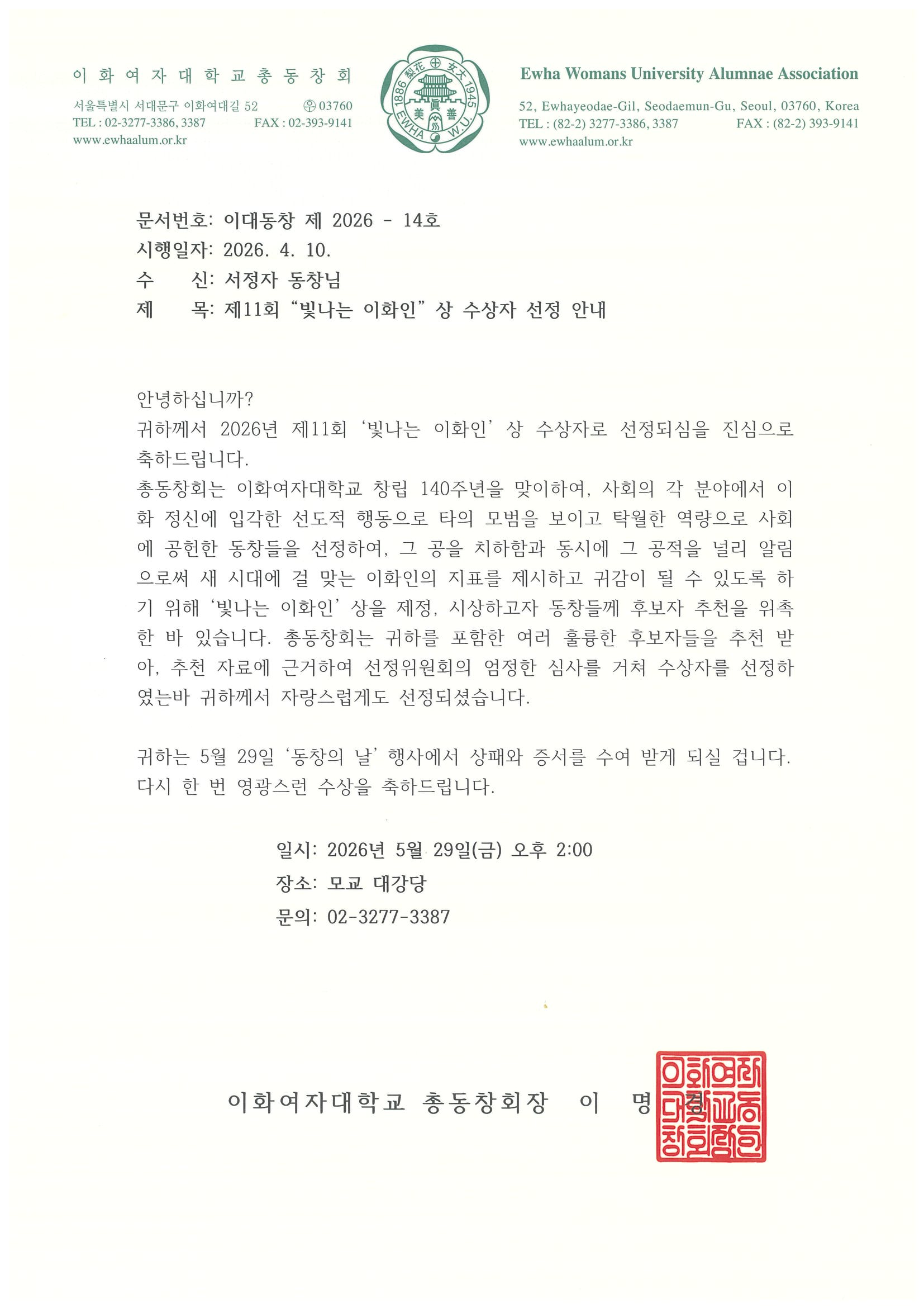 ÀÌÈ¿©´ë Ãѵ¿Ã¢È¸(ȸÀå ÀÌ¸í°æ)´Â ⸳ 140ÁÖ³âÀ» ¸Â¾Æ, ÀÌÈ Á¤½ÅÀ» ¹ÙÅÁÀ¸·Î »çȸ °¢ ºÐ¾ß¿¡¼ ¼±µµÀûÀ¸·Î ÇൿÇϸç ŸÀÇ ¸ð¹üÀÌ µÈ µ¿Ã¢À» ±â¸®±â À§ÇØ ¾öÁ¤ÇÏ°Ô ½É»çÇÑ °á°ú, ¼Á¤ÀÚ »çÀåÀ» ¿ÃÇØÀÇ ¼ö»óÀÚ·Î ¼±Á¤Çß´Ù°í ¹àÇû½À´Ï´Ù. ÀÌ¸í°æ Ãѵ¿Ã¢È¸ÀåÀº ¼ »çÀå¿¡°Ô Á÷Á¢ ÃàÇÏ ¼½ÅÀ» º¸³» "±ä »îÀÇ ¿©Á¤ °¡¿îµ¥ ¾î·Á¿î ¼ø°£µµ ¸¹À¸¼ÌÀ» ÅÙµ¥, ¿Ã°ð°Ô ÇÑ ±æÀ» °É¾î¿À½Å °ÉÀ½À» ÃູÇÑ´Ù"¸ç ¿µ±¤½º·¯¿î ¼ö»óÀ» ÃàÇÏÇß½À´Ï´Ù.