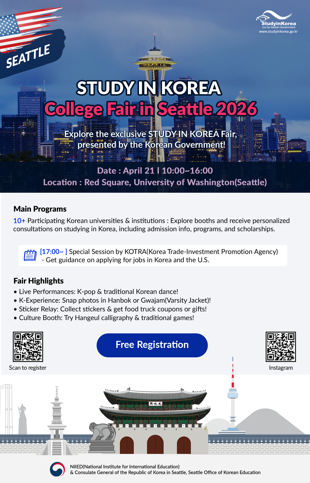 ÀÌ¿ë¿í ±³À°¿øÀå¿¡ µû¸£¸é, À̹ø Çà»çÀÇ ¸ÞÀÎ ¹Ú¶÷ȸ´Â ¿À´Â 21ÀÏ È¿äÀÏ ¿ÀÀü 10½ÃºÎÅÍ ¿ÀÈÄ 3½Ã±îÁö ½Ã¾ÖƲ ¿ö½ÌÅÏ´ëÇб³(UW) ·¹µå ½ºÄù¾î¿¡¼ ¿¸³´Ï´Ù. ¿ÃÇØ´Â ¼¿ï´ëÇб³¿Í ÅÂÀç´ëÇб³ µî Çѱ¹ÀÇ À¯¸í ´ëÇлӸ¸ ¾Æ´Ï¶ó ¼¿ïƯº°½Ã, Çѱ¹´ëÇб³À°ÇùÀÇȸ, KOTRA ½Ç¸®Äܹ븮 ¹«¿ª°ü µî ÁÖ¿ä ±â°üµéÀÌ ´ë°Å Âü¿©ÇÕ´Ï´Ù. ƯÈ÷ Çѱ¹¾î¹ÝÀ» ¿î¿µÇÏ´Â Àα٠°íµîÇб³ Çлý 200¿© ¸íÀÌ ´Üü ¹æ¹®ÇØ Çѱ¹ ´ëÇÐÀÇ »ý»ýÇÑ Á¤º¸¸¦ Á÷Á¢ È®ÀÎÇÒ ¿¹Á¤ÀÔ´Ï´Ù.